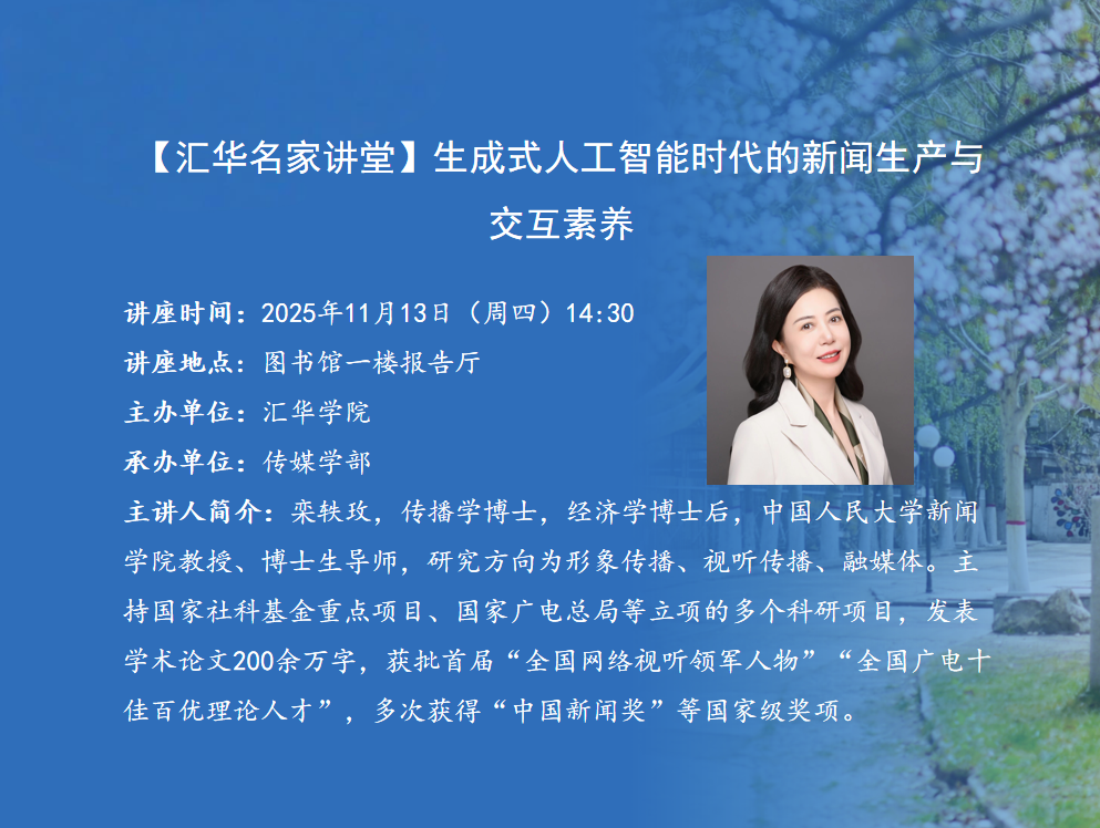 11月13日下午,中国人民大学新闻学院教授、博士生导师,新闻与社会发展研究中心研究员栾轶玫,做客“汇华学院名家讲堂”,为我院师生作学术报告。栾轶玫教授在图书馆一楼报告厅作题为“生成式人工智能时代的新闻生产与交互素养”的学术报告。栾教授系统阐述了生成式人工智能对媒介生态、新闻生产及人机交互素养带来的深刻变革。结合丰富的视频案例,为在场师生生动解析了AIGC技术的应用现状与发展趋势。她指出,在人工智能时代,智能技术正带给媒介生态前所未有的变化,特别是AI合成技术导致海量网络信息真假难辨,真相探寻面临新挑战。在使用人工智能过程中,栾教授认为,一是要学会“judge”,不轻易做判断;二是与时俱进提升媒介素养;三是和任何人要进行有效沟通。在现场实践互动环节中,与会师生在栾教授的指导下,使用现有大模型平台,亲身体验人机协同完成内容创作的全过程,进一步加深了对人工智能工具使用的理解。讲座前,栾轶玫教授与副院长李振国、传媒学部教师代表和进行了座谈交流,就新闻学专业人才培养进行了探讨,对我院新闻学专业人才培养给出了科学指导和合理建议。