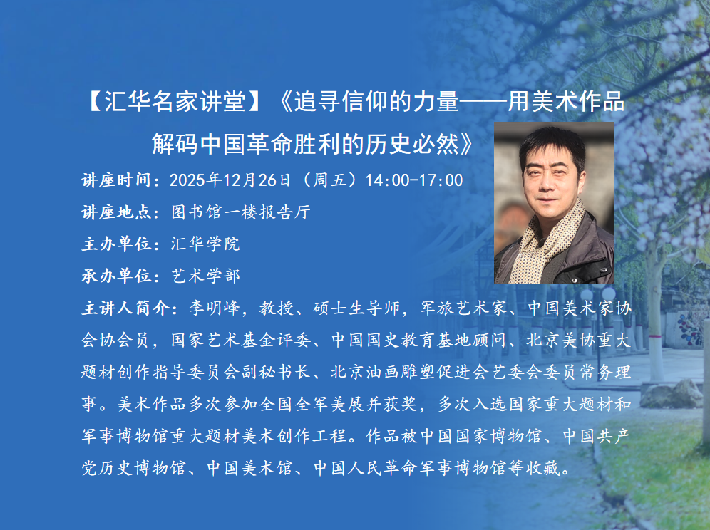 主题:尺素千里 华章日新——师生书画艺术展时间:2025年12月24日——12月28日地点:第三教学楼一楼展览厅简介:时序更替,岁物丰成。值此新年到来之际,艺术学部主办的“尺素千里 华章日新——师生书画艺术展”诚邀广大师生参观指导。本次展览涵盖国画、油画、书法、设计、动画等多个艺术门类,共计展出近百余件师生书画精选佳作,其中既包含传承经典的功力之作,也不乏探索新意的现代表达。展览旨在全面呈现我院书画艺术的教学成果与创作活力,为师生提供高水平的交流平台,并推动传统艺术的校园美育与社会传播。所有展品均经过精心遴选,体现了学术性、创新性与艺术性的统一,欢迎您参观品鉴、交流指导!主办单位:汇华学院工会、艺术学部、汇华学院马克思主义学院