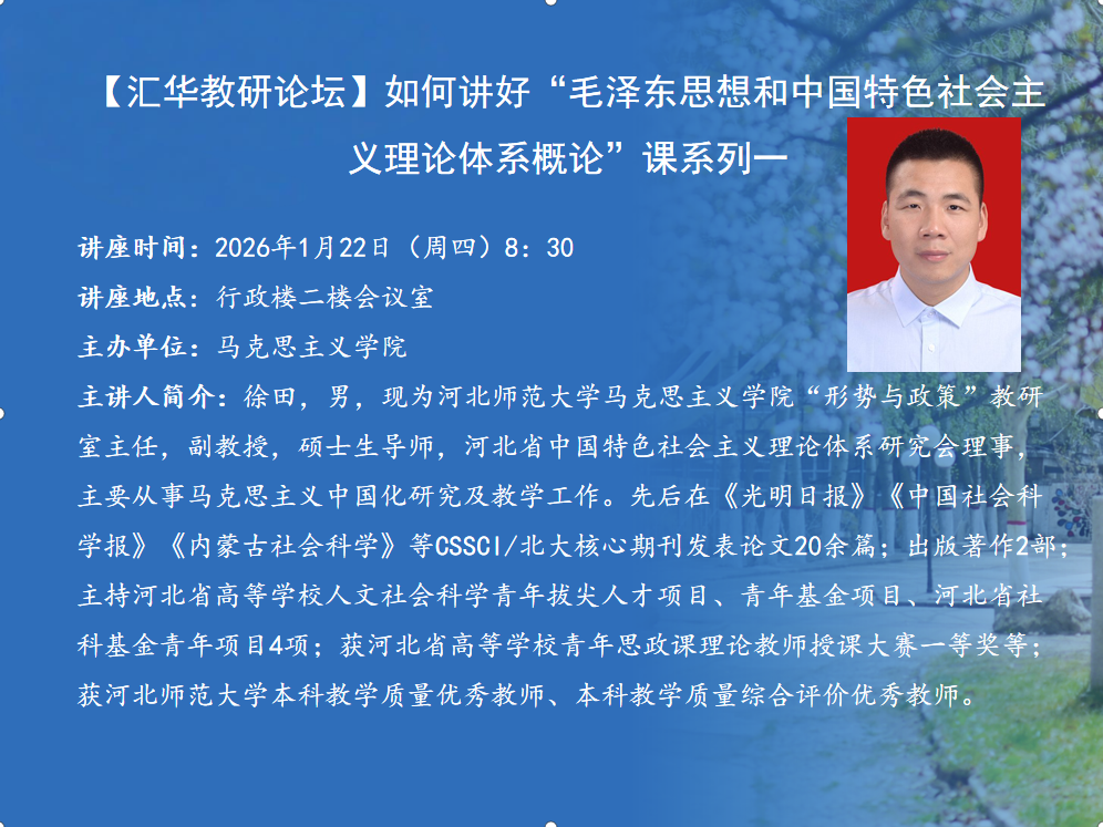 2026年寒假放假通知根据学院校历安排,现将我院2026年寒假放假时间及有关事宜通知如下:一、1月24日(腊月初六,星期六)放假,3月1日(正月十三,星期日)全体师生报到,3月2日(正月十四,星期一)正式上课。二、寒假值班地点及联系电话地点:行政楼101室电话:(0311)80785888三、各单位要高度重视假期的校园安全工作,切实做好假期及春节期间学校安全管理工作。祝全体师生假期愉快! 学院办公室 2026年1月19日