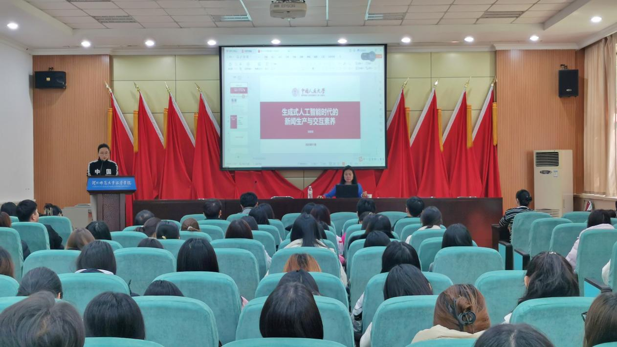 栾轶玫教授在图书馆一楼报告厅作题为“生成式人工智能时代的新闻生产与交互素养”的学术报告。栾教授系统阐述了生成式人工智能对媒介生态、新闻生产及人机交互素养带来的深刻变革。结合丰富的视频案例,为在场师生生动解析了AIGC技术的应用现状与发展趋势。她指出,在人工智能时代,智能技术正带给媒介生态前所未有的变化,特别是AI合成技术导致海量网络信息真假难辨,真相探寻面临新挑战。在使用人工智能过程中,栾教授认为,一是要学会judge,不轻易做判断;二是与时俱进提升媒介素养;三是和任何人要进行有效沟通。