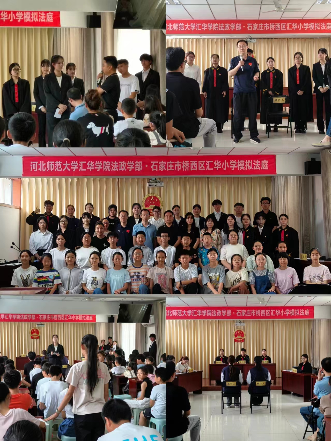 法政学部与汇华小学联合开展“模拟法庭”活动-缩小 放大+ 2024-06-076月6日下午,法政学部2023级法学专业在石家庄市桥西区汇华小学开展预防青少年犯罪的模拟法庭活动。出席活动的嘉宾有冀华律师事务所的靳陈星律师、赵金璐律师,汇华学院法政学部部长徐鹏,汇华小学领导班子成员姜文杰、李亮、程斌斌。汇华小学70余名小学生参与观摩,积极进行互动。 首先,同学们以“情景再现”的方式还原了因打饭插队而引起的校园霸凌的过程。情景生动,清晰明了,吸引了小学生的注意力。随后,同学们扮演审判长、被告人和公诉人等角色,依照法定程序,有条不紊地开展了法庭调查、法庭辩论等环节,审判长、审判员、书记员等各司其职,完整呈现了法庭审理的全过程,小学生们“沉浸式”体验了庭审现场。法庭辩论阶段,辩护人就被告人的犯罪年龄、主观恶性、认错态度等方面进行辩论请求从轻量刑。整个过程节奏流畅,也展示出法律的人文关怀。小学生们全神贯注观看。在审判长宣布合议庭休庭评议期间,主持人与汇华小学的学生进行关于此校园霸凌案件的问答互动,比如“你认为被告人的做法有何不足”、“被告人应该受到什么样的处罚”、“如果遇到校园霸凌该如何应对”等,同学们积极踊跃的展现自己的观点,激发了对法律的学习兴趣。最后,靳陈星律师、赵金璐律师对模拟法庭进行专业点评,同时鼓励同学们努力提升专业素养,坚定职业信念,勇于担当作为。汇华小学党支部副书记李亮总结此次活动时感谢了律师团队提供的专业指导和学部师生的大力支持,希望汇华小学的同学们敬畏法律,明白自己当前年龄段应该承担的民事责任或可能承担的刑事责任,希望同学们积极参与法治教育的实践,争做知法、懂法、守法,能堪当民族复兴重任的时代新人。