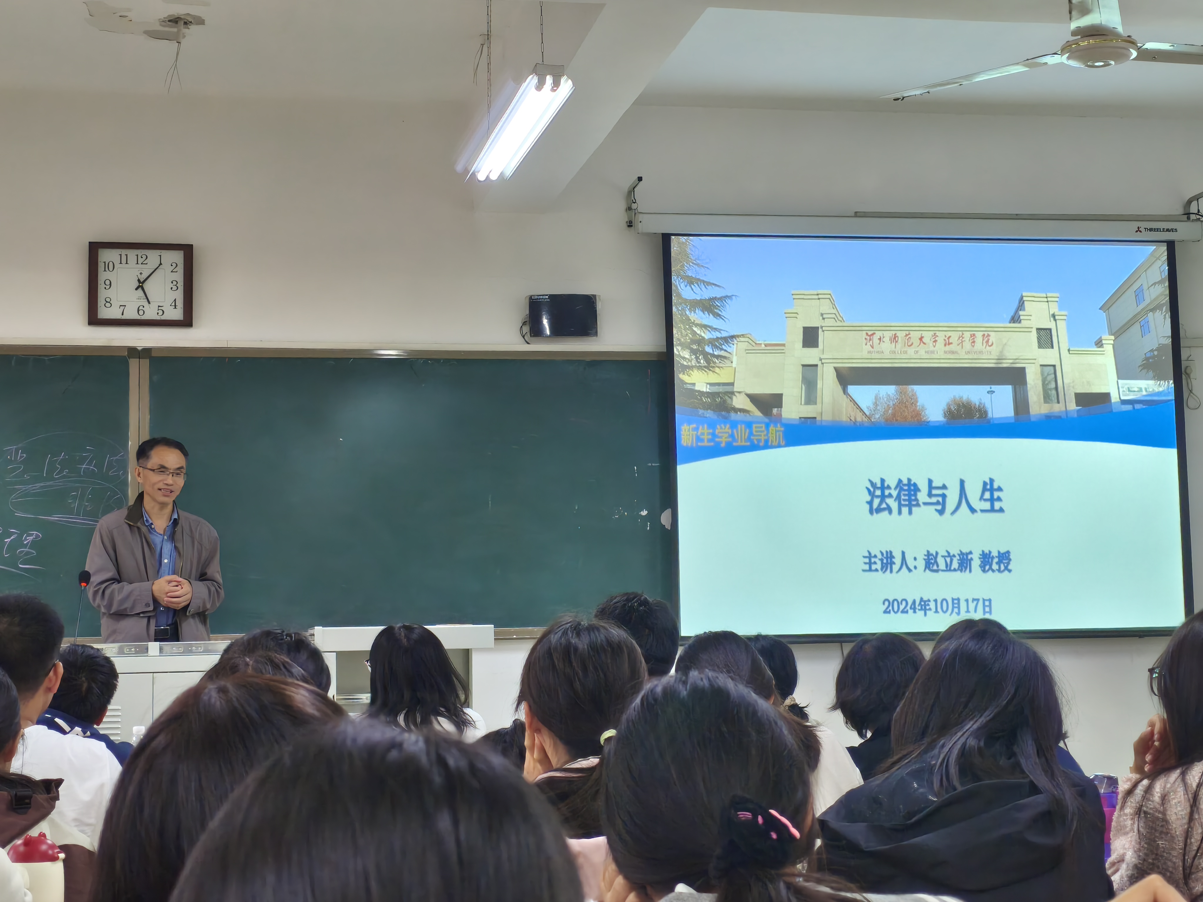 赵立新教授为2024级法学专业新生作学业导航讲座-缩小 放大+ 2024-10-18为帮助新生更好地了解法学专业,激发新生对学业的热爱和追求,提高专业认知以及为自己的学业而奋斗的意识,10月17日上午,法政学部邀请河北师范大学法政与公共管理学院赵立新教授围绕“法律与人生”为2024级法学专业新生进行专题讲授,学部教学副部长范玉茹老师、辅导员张星老师、教学秘书郭园园老师与同学们一同聆听了讲座。