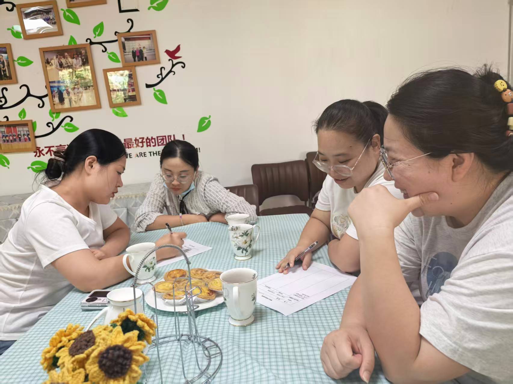 花朵、茶点、桌摆的精心布置,为家园共话提供了温馨、轻松的氛围。活动开始家长们自愿分组体验孩子们的搭建活动。家长们商量搭建计划、材料的使用,分工合作,共同完成搭建。家长们沉浸式感受了孩子们在搭建活动中的状态,每个小组都尽最大努力完成了自己的作品。