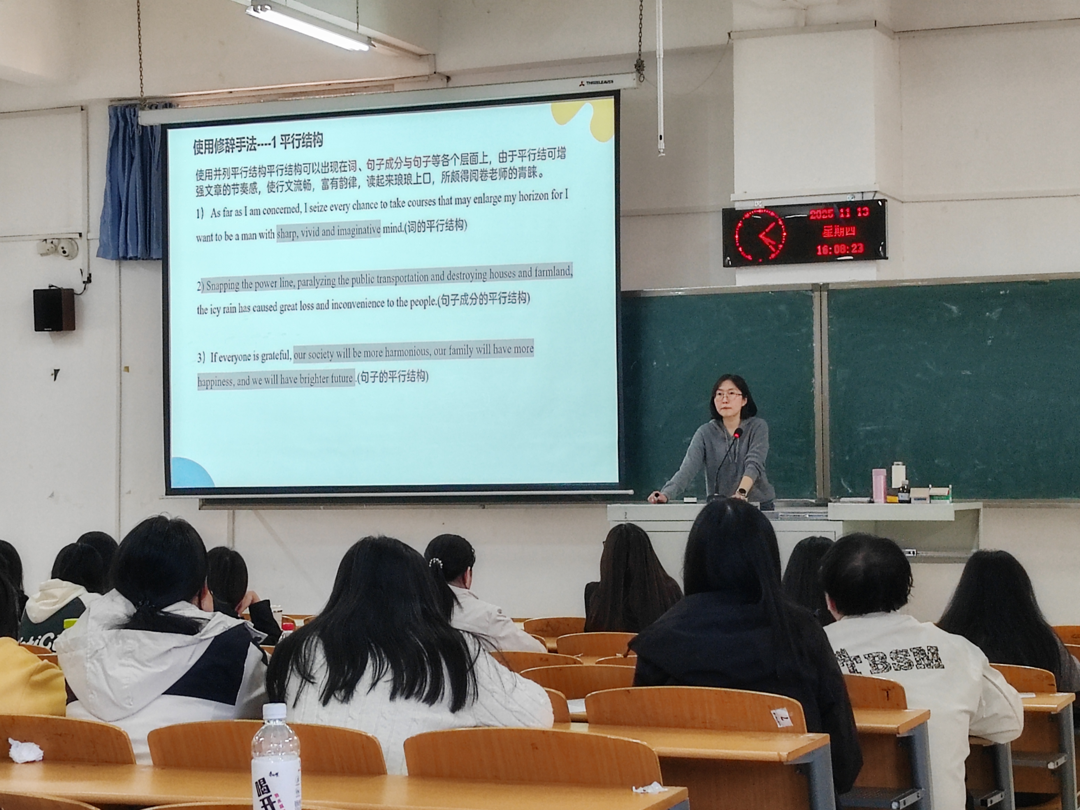11月6日下午,贾锐老师作“听力和阅读答题技巧”首场专题讲座,同学们济济一堂,座无虚席。讲座中,贾锐老师结合自身教学经验与四六级命题规律,对阅读应试策略进行解析,详细讲解了“题型分类破题”“长难句拆解”等实用方法;同时也讲解了听力“预读定位”“同义替换”等基础技巧,通过真题案例解析帮助同学们理清答题思路。讲座现场互动频繁,同学们反馈收获颇丰。