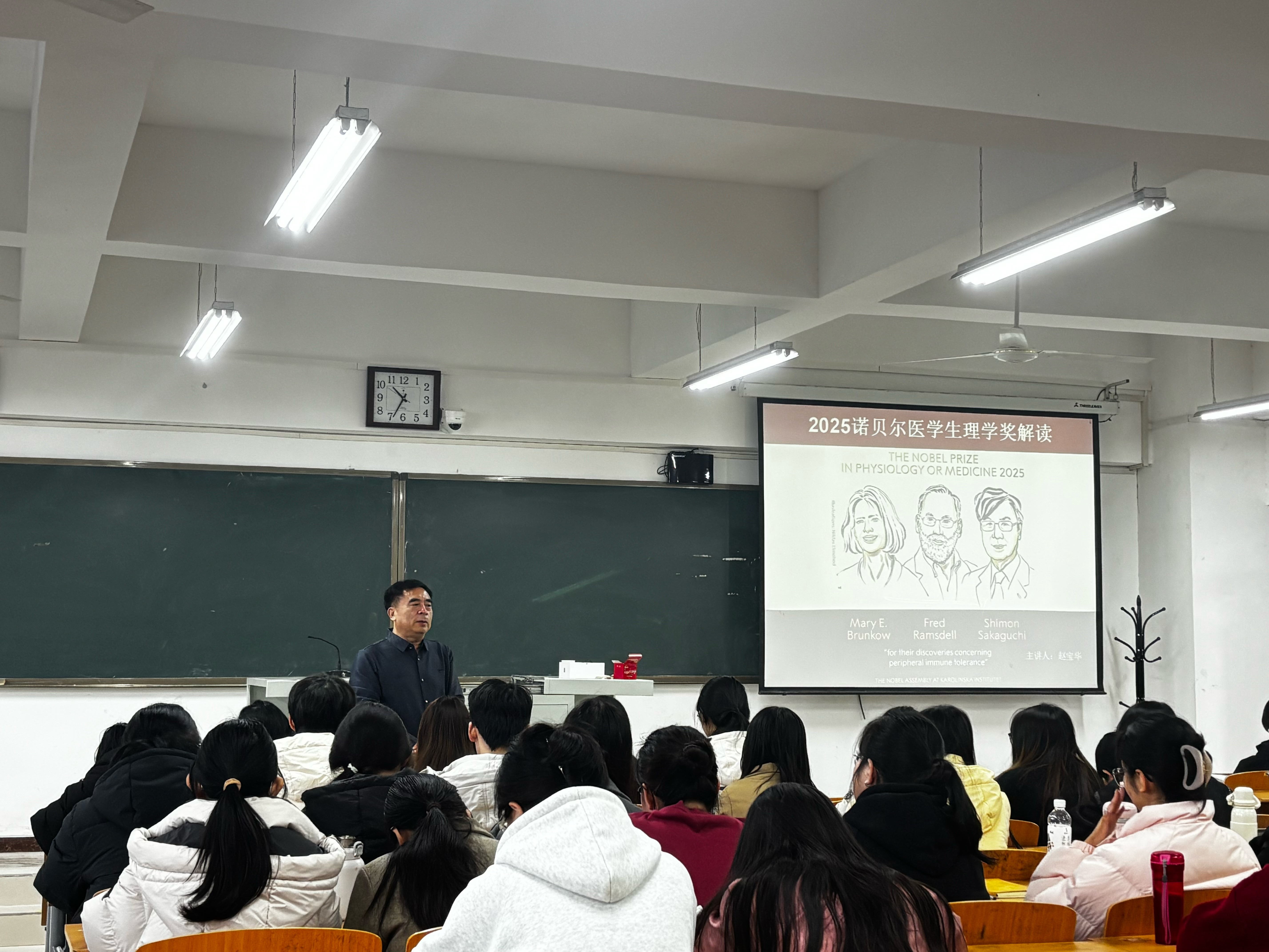 11月7日,河北师范大学三级教授、博士研究生导师赵宝华,应邀做客我院“汇华名家讲堂”,在第五教学楼404教室作题为“2025年诺贝尔医学生理学奖解读”的学术报告。理学部部长张增水主持讲座,生物科学专业学生到场聆听。 首先,赵宝华教授介绍2025年诺贝尔生理学或医学奖授予的三位科学家:玛丽•布伦科、费雷德•拉姆斯德尔和坂口志文。赵宝华教授指出,三位科学家发现的“免疫系统的保镖—调节性T细胞”让我们从“被动理解免疫耐受”走向“主动调控免疫平衡”。接着,他重点讲解了中枢免疫耐受、外周免疫耐受与Treg细胞的发现,通过例举病例,分析免疫耐受的形成机制与外周免疫耐受的机制。最后,赵宝华教授对免疫耐受的前景进行展望,他强调,科研的真正精神,是在质疑中坚守真理,在孤独中追寻答案,用执着与理性去点亮未知的黑暗!