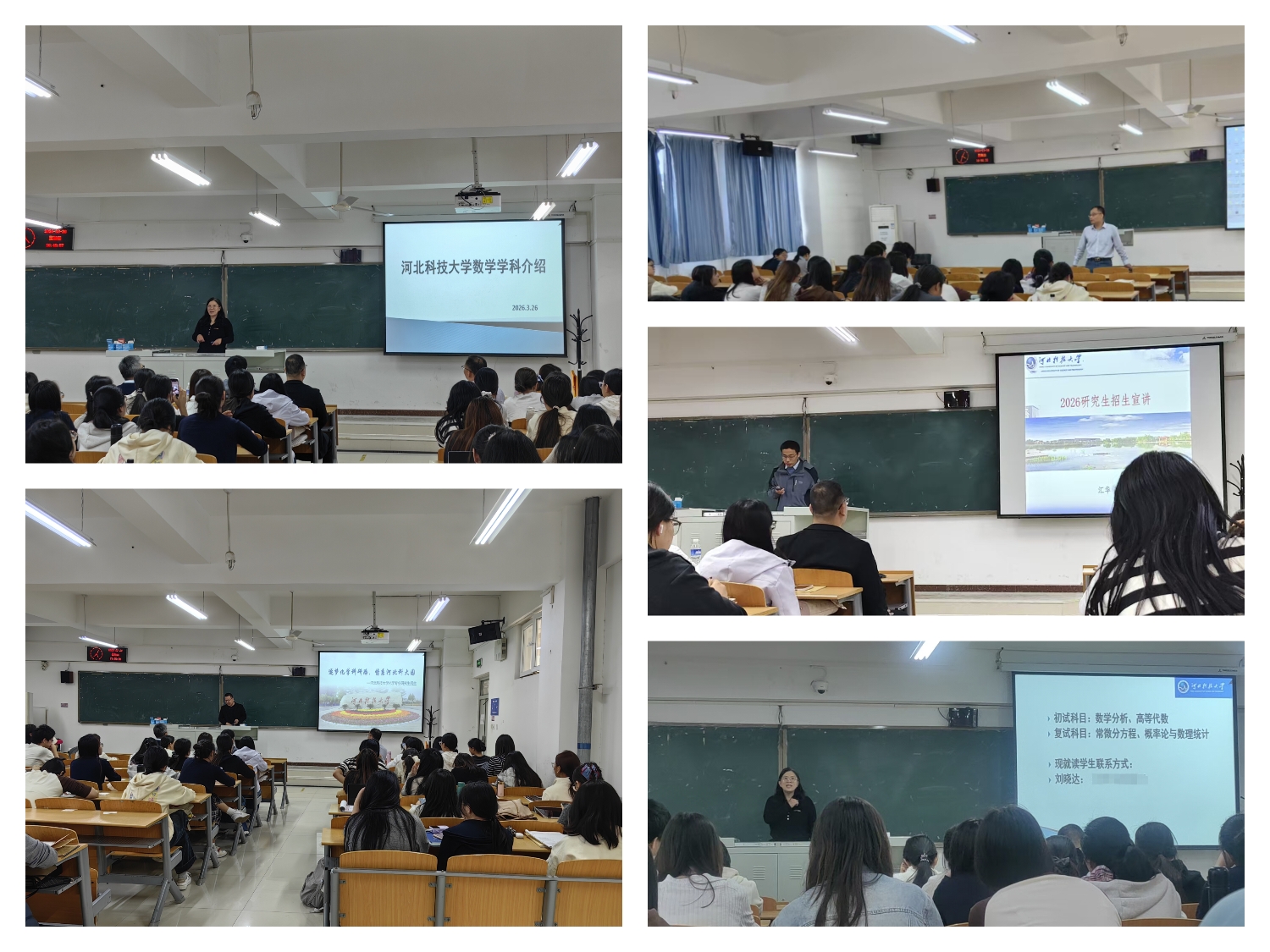 为精准对接学子考研需求,搭建优质升学交流桥梁,2026年3月26日,河北科技大学理学院专家团队来到汇华学院,为理学部2022、2023级数学、物理、化学三个专业的100余名学生开展研究生招生专题宣讲,全方位解读学科建设、招生政策、备考方向及调剂相关事宜,为学子升学规划提供专业指导。 宣讲伊始,播放了河北科技大学宣传视频,直观展现了学校的办学风貌、校园环境与学科发展实力。视频结束后,理学院数学系副主任蔡霞、化学系副主任李义磊、物理系刘国才老师分别围绕数学、物理、化学三个专业介绍了各学科的发展历程、师资队伍、核心研究方向及科研平台成果,明确了各专业考研初试、复试的具体科目;同时,老师们还详细介绍了各专业完善的研究生奖助体系、以及毕业生多元的深造方向和就业去向。最后,理学院副院长阎晨光对本次宣讲内容进行全面总结,点明河北科技大学拥有优质的学科平台、充足的科研经费、成熟的人才培养体系,且校园宜居、生活配套便利;理学院与汇华学院渊源深厚,学子报考及调剂均具备明显优势,同时,他诚挚邀请同学们到学校参观。宣讲结束后,老师们按学科分别与学生开展现场交流答疑,针对大家提出的考研复习规划、调剂流程等问题逐一解答。