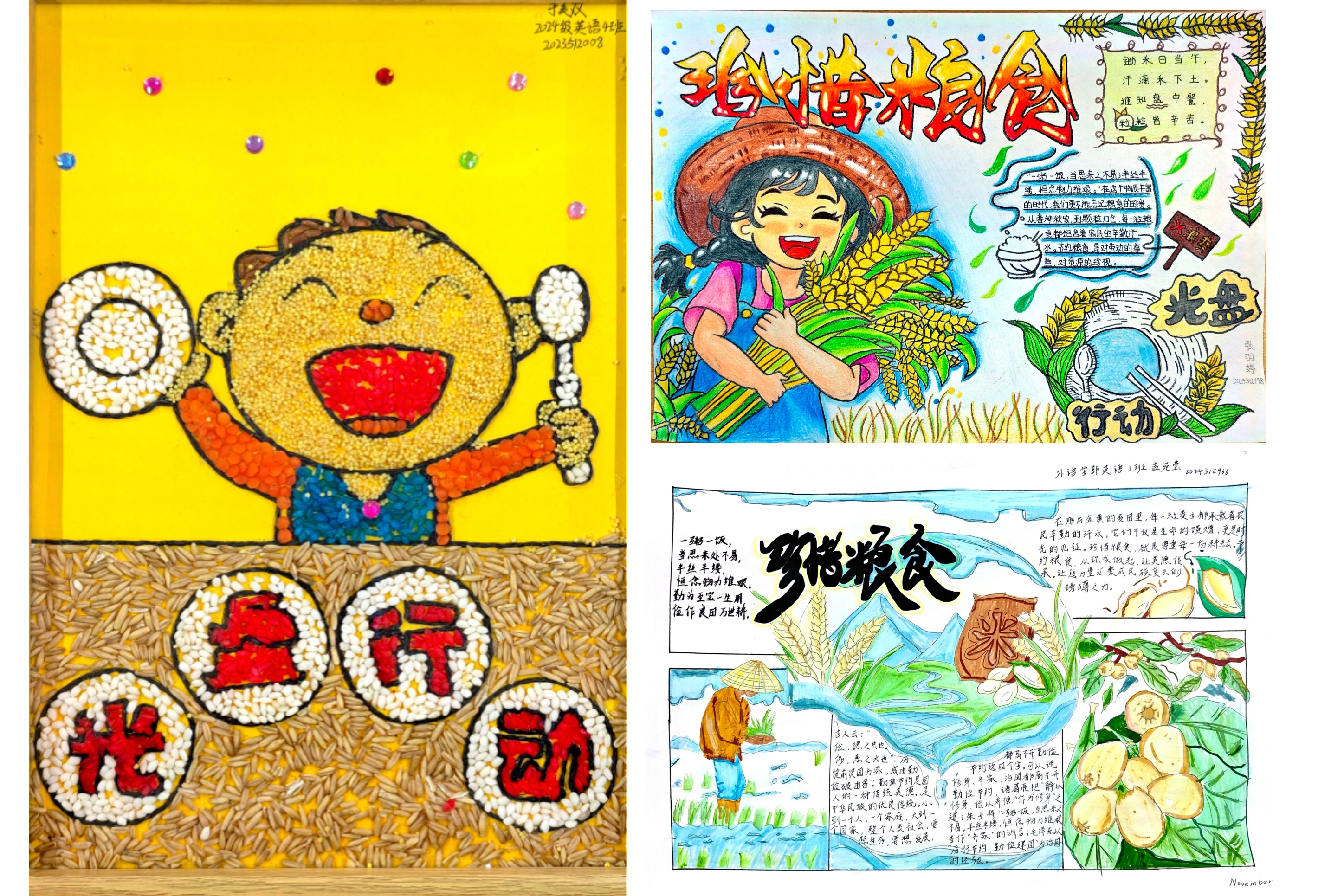 此次活动围绕“光盘”主题,设置短视频征集、手抄报与粮食画评选等项目。同学们热情高涨,通过30秒的短视频、手绘海报和拼贴谷物作画的形式,踊跃开展创作,展现“珍惜粮食、反对浪费”的理念,表达对生活的热爱与对节俭美德的推崇。活动共征集视频作品12份,其中3份获奖;粮食画及手抄报作品103份,其中25份获奖。在短视频项目中,2023级英语3班苏梦晗的作品《懒羊羊的光盘小秘密》以动画形象“懒羊羊”的视角,呼吁大家践行“光盘行动”,树立节约粮食的观念,荣获一等奖;在手抄报评选中,2024级英语1班孟宛莹的《粮间絮语》、英语3班张羽婷的《稻穗里的“粮”辰美景》及英语2班张付文轩的《爱惜粮食》荣获一等奖;2024级英语4班于美双的作品《光盘行动》使用多种谷物拼贴,创作出新颖独特的艺术画,荣获粮食画项目一等奖。