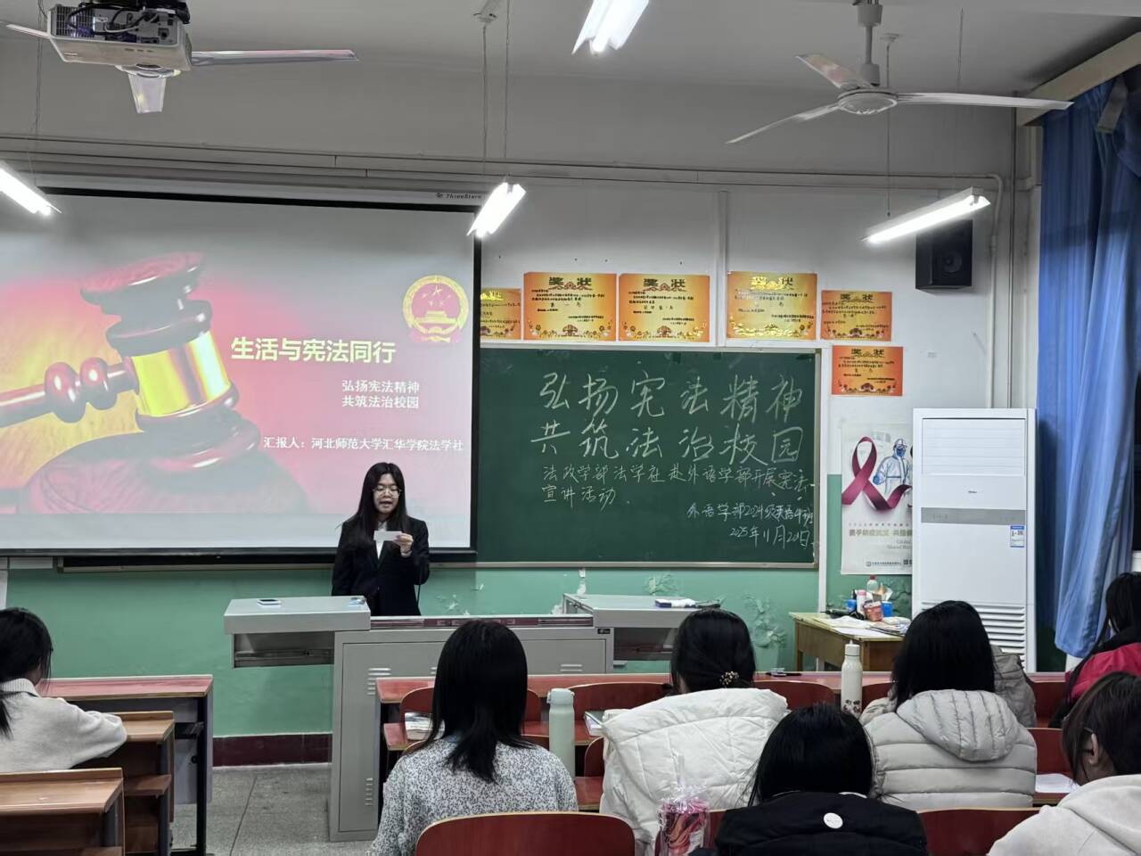 本次宣讲由法政学部法学社成员李文静、杨淼淼两位同学担任主讲,内容从四方面展开:一是系统讲解宪法的概念、起源、发展历程等基础知识,夯实认知基础;二是解读宪法中国家性质、根本制度、公民的权利和义务等核心内容,阐释宪法的核心要义;三是结合大学生活实际,讲解宪法对青年成长的现实意义,引导学生树立法治意识;四是通过“理论讲解+案例分析”剖析宪法典型案例,让抽象的法条具象化。宣讲过程中,同学们全神贯注,认真聆听,受益匪浅。