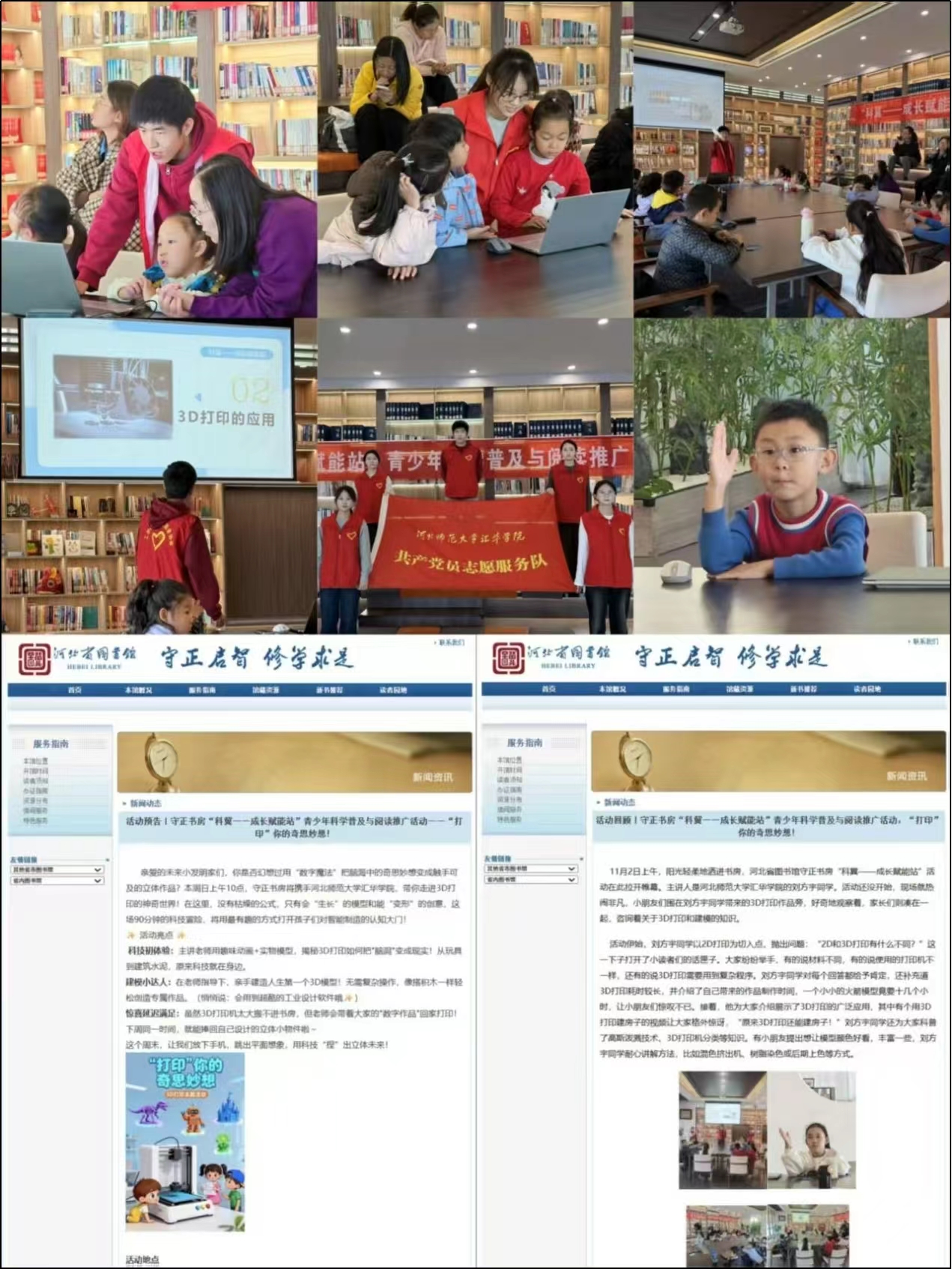 11月2日上午,工学部“人工智能AI筑梦促成长”志愿服务队再次受邀走进河北省图书馆守正书房“科冀——成长赋能站”,开展《关于3D打印的那些事》主题讲座及志愿服务活动。此次活动再次获得现场青少年与家长高度认可,并被河北省图书馆官网专题报道,进一步彰显了我院在科普服务与技术实践领域的良好社会形象。